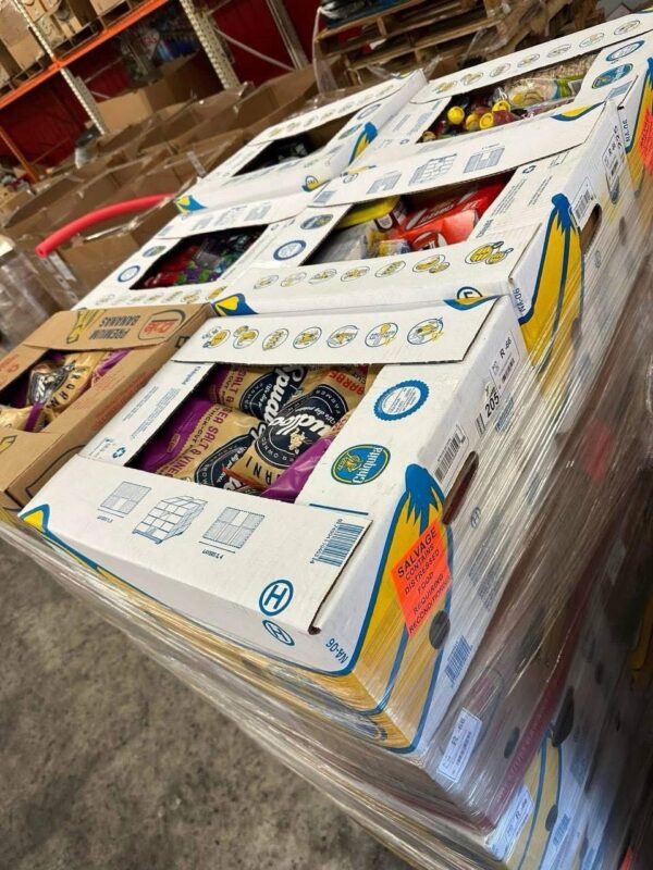Each pallet contains a mix of grocery items commonly found in banana box pallets, including: